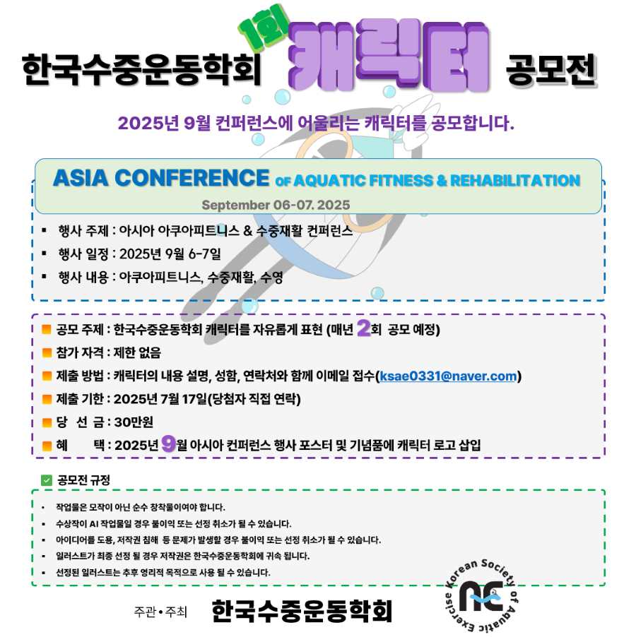 ´Ù°¡¿À´Â 9¿ù, ´ëÇѹα¹¿¡¼ °³ÃֵǴ Asia Aquafitness & Aquatic Rehabilitation Conference¸¦ ´õ¿í Ưº°ÇÏ°Ô ¸¸µé 'Çѱ¹¼öÁ߿ÇÐȸ °ø½Ä ij¸¯ÅÍ'¸¦ ã½À´Ï´Ù!