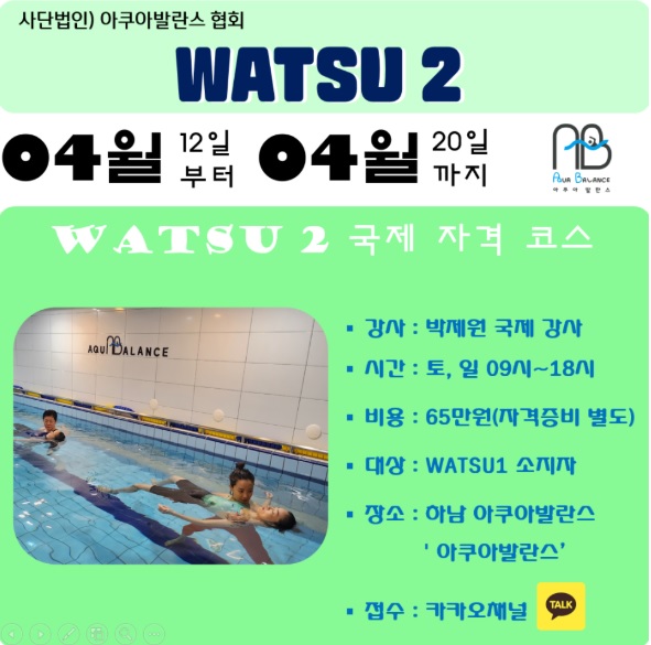 ±âº» WATSU 1À» À̼öÇÑ ºÐµéÀÌ Âü°¡ÇÒ ¼ö ÀÖ´Â °í±Þ °úÁ¤ÀÔ´Ï´Ù.